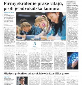 Mgr. Veronika Pázmányová pro PRÁVO A JUSTÍCIA (Špecial Hospodárskych novin): Za skrátenie koncipientskej praxe sa zasadzujú okrem samotných koncipientov aj mnohé advokátske kancelárie. Ide najmä o väčšie firmy s dobrým renomé a so stabilným portfóliom klientov. Pre menšie kancelárie alebo pre advokátov, ktorí pracujú sami, je zamestnávanie koncipientov so zárobkom často iba tesne nad úrovňou minimálnej mzdy počas celých piatich rokov výhodné. Skrátenie preto časť praxe víta. „Nás to teší. Dlhodobo sme boli proti päťročnej praxi,“ potvrdzuje Pázmányová.