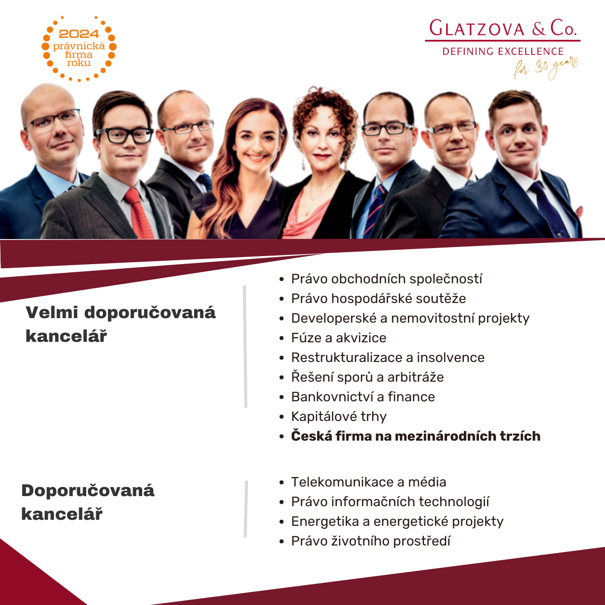 S potěšením oznamujeme, že naše právnická kancelář byla oceněna v soutěži Právnická firma roku 2024 ve 13 různých kategoriích, včetně zvláštní kategorie Česká firma na mezinárodních trzích. Tento úspěch odráží naši dlouhodobou snahu poskytovat našim klientům vysoce kvalitní a inovativní právní služby, a to nejen na českém trhu, ale také v globálním měřítku.