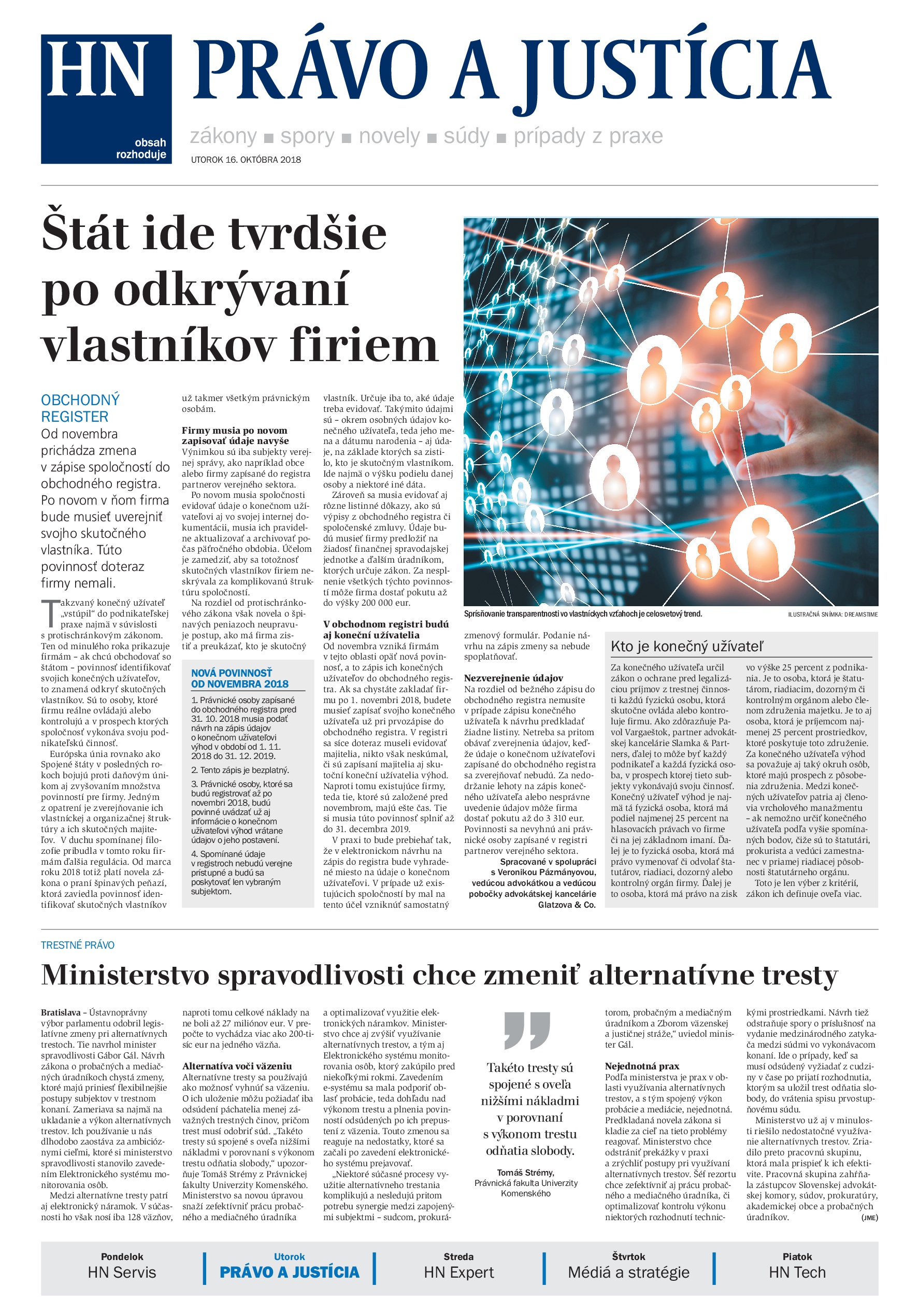 Mgr. Veronika Pázmányová pre PRÁVO A JUSTÍCIA (Špecial Hospodárskych novin): Od novembra prichádza zmena v zápise spoločností do obchodného registra. Po novom v ňom firma bude musieť uverejniť svojho skutočného vlastníka. Túto povinnosť doteraz firmy nemali.